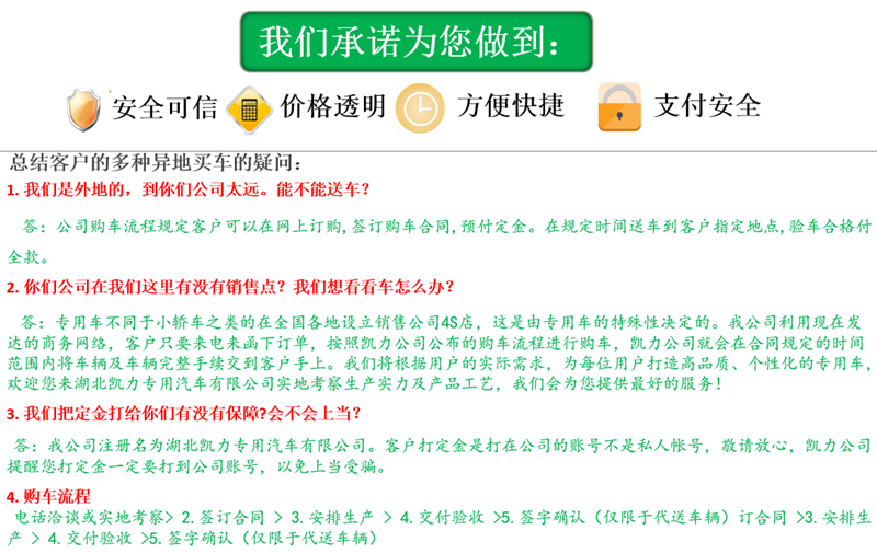 | 2、購車流程: | 1、咨詢洽談(電話洽談或來廠考察洽談) 2、簽訂汽車購銷合同(傳真、郵遞或者來廠簽訂) 3、我廠按時按質生產 4、交付驗收 >>點擊查看詳細內容 |